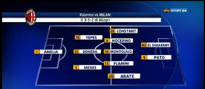 PALERMO MILAN – Grandi novità in casa Milan in vista della sfida di Palermo in programma fra poco più di un’ora. Allegri punta su un 3-5-2 rispetto al 3-4-3 ipotizzato nelle scorse ore, con un centrocampo folto formato da Abate, Montolivo, Flamini, Nocerino e Constant. Presenti quindi le due novità Nocerino e Flamini, mai menzionati nelle scorse ore, al fianco di Montolivo. Sia De Jong quanto capitan Ambrosini vanno quindi in panca. Ecco di seguito le formazioni pubblicate da Sky Sport.