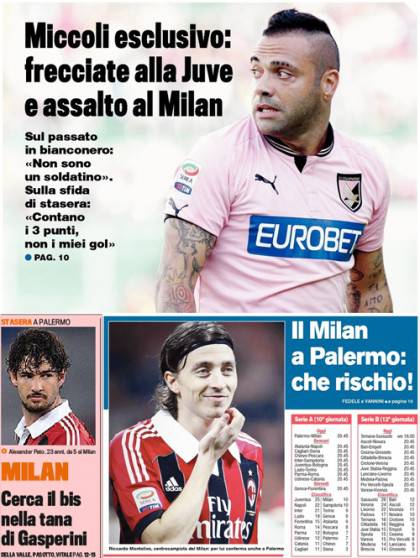 RASSEGNA STAMPA MILAN FOTO – Di seguito potete trovare i principali titoli dei tre quotidiani sportivi, La Gazzetta dello Sport, Corriere dello Sport e Tuttosport, riguardanti naturalmente il nostro Milan. Oggi i principali quotidiani si dedicano naturalmente alla sfida in programma questa sera, l’anticipo della decima giornata di Serie A fra Palermo e Milan, delle ore 20.45. Allegri è chiamato ad un nuovo esame contro la besta “rosanero” ma soprattutto contro Miccoli, che quando vede il Diavolo esplode letteralmente.