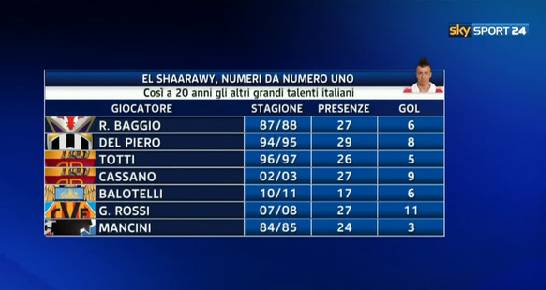 FENOMENO EL SHAARAWY 20 ANNI – Sono numeri da vero fenomeno quelli di El Shaarawy in questo primo scorcio di stagione. L’attaccante del Milan ha segnato ben 7 reti in queste prime 10 uscite, senza aggiungere i gol in Champions League. Numeri incredibili, come sottolinea Sky Sport, soprattutto se paragonati a grandissimi del passato nonchè a stelle come Rooney e Cristiano Ronaldo, tutti giocatori che all’età di 20 anni (quella attuale del Faraone), hanno fatto peggio dell’italo-egiziano. Messi ha ripetuto gli stessi numeri di El Shaarawy (sette gol in 10 partite, di cui due su rigore). Solo il Fenomeno Ronaldo ha fatto meglio visto che a 20 anni giocava titolare nel Barcellona e fece 34 gol in 37 partite…