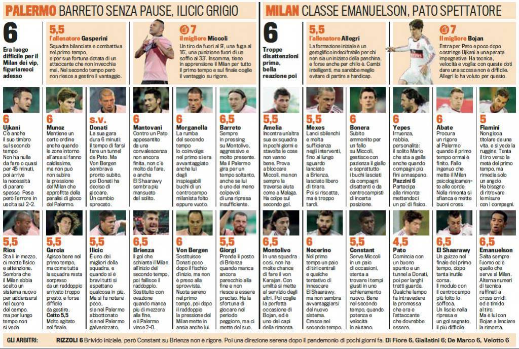 PALERMO MILAN VOTI PAGELLE GAZZETTA – Di seguito potete visionare i voti e le pagelle firmati Gazzetta dello Sport relativi alla sfida giocatasi ieri sera fra Palermo-Milan, anticipo della decima giornata di Serie A conclusosi con il risultato di 2 a 2, parità. Grandissima prova di Bojan Krkic, subentrato dalla panchina e risultato essere il migliore dell’incontro (voto 7). Molto bene anche El Shaarawy, ancora in rete ieri, per la settima volta. Male invece Alexandre Pato un pesce fuor d’acqua (voto 4.5). Infine, promossi anche Emanuelson e Montolivo.