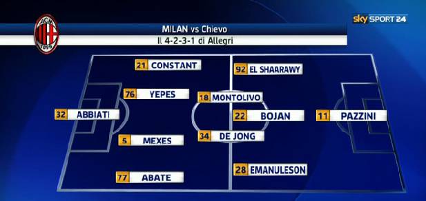 MILAN CHIEVO FORMAZIONI – Importanti aggiornamenti sulle probabili formazioni di Milan-Chievo dopo la conferenza stampa di Allegri. Il mister ha svelato quale sarà il modulo che verrà adottato, il 4-2-3-1, complice anche la squalifica di Bonera. Sulle fasce giocheranno Abate e Constant mentre al centro dovrebbero giocare Mexes e Yepes. In porta torna Abbiati mentre in cabina di regia la coppia De Jong-Montolivo. Sulla linea dei trequartisti, infine, Bojan promosso titolare al fianco di El Shaarawy ed Emanuelson e dietro a Pazzini, favorito su Pato.