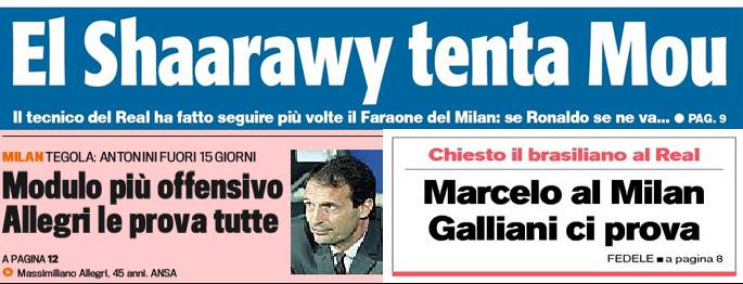 RASSEGNA STAMPA MILAN FOTO – Di seguito potete trovare i principali titoli dei tre quotidiani sportivi, La Gazzetta dello Sport, Corriere dello Sport e Tuttosport, riguardanti naturalmente il nostro Milan. Tuttosport parla di una notizia di mercato con al centro El Shaarawy. Secondo quanto raccolto il Real Madrid di Josè Mourinho sarebbe fortemente interessato al Faraone e non è da escludere un tentativo concreto a breve. Il CorSport, invece, riporta l’interesse del Milan nei confronti di Marcelo, terzino sinistro delle Merengues di origini brasiliane.