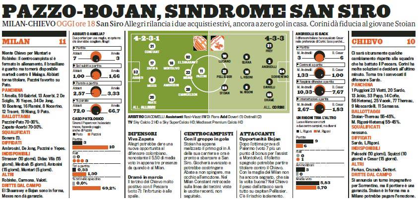 MILAN CHIEVO PROBABILI FORMAZIONI – Poco più in basso potrete visionare le probabili formazioni di Milan-Chievo firmate Gazzetta dello Sport. Spazio al ritorno di 4-2-3-1 con Mexes e Constan sulle fasce, Abbiati che torna in porta dopo l’infortunio, mentre in cabina di regia spazio alla coppia De Jong-Montolivo. Sulla trequarti giocherà Bojan dal primo minuto dopo l’ottima prova di Palermo, affiancato dai soliti Emanuelson ed El Shaarawy. Infine in attacco favorito Giampaolo Pazzini su Pato, quest’ultimo, reduce da una prova negativa contro i rosanero.