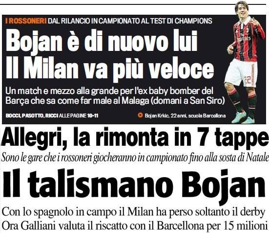 RASSEGNA STAMPA MILAN FOTO – Di seguito potete trovare i principali titoli dei tre quotidiani sportivi, La Gazzetta dello Sport, Corriere dello Sport e Tuttosport, riguardanti naturalmente il nostro Milan. Oggi si sottolinea in particolare le grandi prestazioni di Bojan Krkic nelle ultime due uscite contro Palermo e Chievo, l’arma in più di Allegri in vista della sfida contro il Malaga di Champions League. Il Milan, affronterà da qui alla sosta, un vero e proprio tour de force…