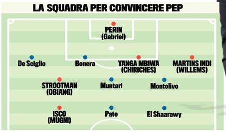 CALCIOMERCATO MILAN – Non si placano i rumors di mercato sul Milan e Pep Guardiola. Stamane il quotidiano Tuttosport riporta quella che potrebbe essere la squadra in grado di convincere il tecnico catalano al grande trasferimento a Milano. Sarebbe pronto quindi un 4-3-3, il classico schema guardiolano, con Perin o Gabriel in porta, difesa formata dai nuovi arrivi Yanga Mbiwa/Chiriches e Martins Indi/Willems. A centrocampo spazio Strootman o Obiang affiancatO a Montolivo e Muntari. Infine, in attacco Pato-El Shaarawy e uno a scelta fra i due gioielli Isco e Mugni. Una squadra tutto sommato non eccessivamente dispendiosa: ce la faranno Berlusconi e Galliani?