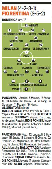 MILAN FIORENTINA PROBABILI FORMAZIONI – Il Milan scenderà in campo domenica pomeriggio alle ore 15.00 per la sfida contro la Fiorentina. I rossoneri dovrebbero confermare il 4-2-3-1 con qualche novità rispetto alle ultime uscite a cominciare dalla fascia destra dove, per via dell’infortunio di Abate, giocherà De Sceglio con Constant confermato sulla sinistra. A centrocampo bocciato De Jong, al suo posto Ambrosini vicino a Montolivo. In attacco, infine, si rivedranno i 4 di martedì sera con Pato prima punta supportato da El Shaarawy, Bojan ed Emanuelson. Di seguito la foto pubblicata da La Gazzetta dello Sport.
