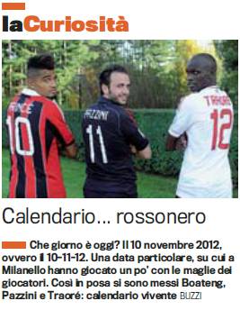 CALENDARIO MILAN – E’ tempo di calendario in casa Milan. Vista la data odierna, 10 novembre 2012, 10/11/12, Boateng, Pazzini e Traorè hanno ben pensato di mettersi in posa formando così la data in questione con i numeri sulle rispettive maglie. Un’idea simpatica, chiaro indizio che a Milanello sembra essere tornato il sereno. Di seguito la foto pubblicata stamane da La Gazzetta dello Sport.
