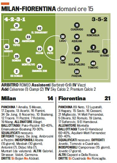 MILAN FIORENTINA PROBABILI FORMAZIONI – Più in basso potrete visionare le probabili formazioni di Milan-Fiorentina, gara valevole per la dodicesima giornata di Serie A, che si giocherà domenica pomeriggio alle ore 15.00 in quel di San Siro. Allegri dovrebbe confermare il 4-2-3-1 delle ultime uscite con la probabile novità di El Shaarawy in panchina per concedere un po’ di riposo al Faraone. Non è da escludere una partenza da titolare di Boateng al fianco di Bojan e Robinho e dietro ad Alexandre Pato, in gol martedì scorso in Champions League.