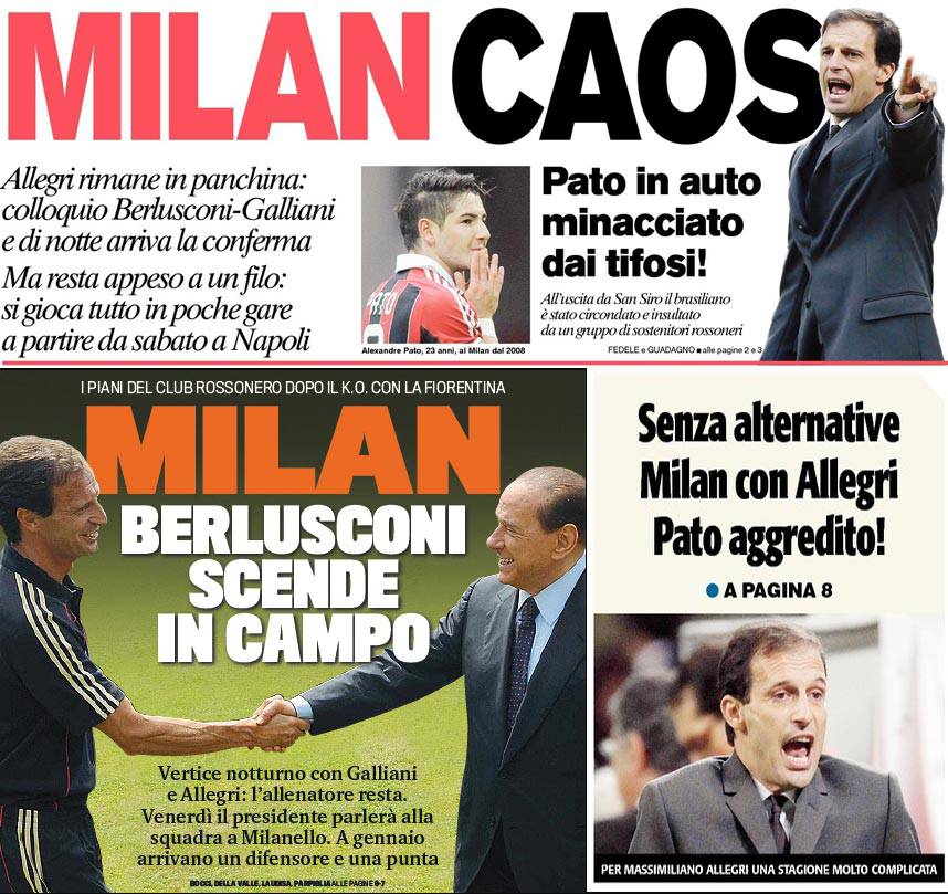 RASSEGNA STAMPA MILAN FOTO – Di seguito potete trovare i principali titoli dei tre quotidiani sportivi, La Gazzetta dello Sport, Corriere dello Sport e Tuttosport, riguardanti naturalmente il nostro Milan. Milan caos titolare il Corriere dello Sport sottolineando l’aggressione dei tifosi ai danni di Alexandre Pato, in auto. Sulla Gazzetta invece si da ampio spazio a Berlusconi che venerdì sarà a Milanello e che sta preparando la campagna acquisti invernale. Anche Tuttosport, infine, sottolinea l’aggressione a Pato.