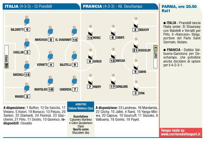 ITALIA FRANCIA PROBABILI FORMAZIONI – L’Italia scenderà in campo questa sera per sfidare in amichevole la Francia per quello che è già stato ribattezzato il derby d’Europa. Prandelli punterà sul trio inedito formato da El Shaarawy, Balotelli e Candreva. A centrocampo spazio a Montolivo sull’interno di destra con Verratti al centro e Marchisio sul versante opposto. Infine difesa con Maggio e Balzaretti sulle corsie e Barzagli e Chiellini al centro davanti a Sirigu. Solo panchina, per la Francia, per Yanga Mbiwa, obiettivo di mercato del Milan.