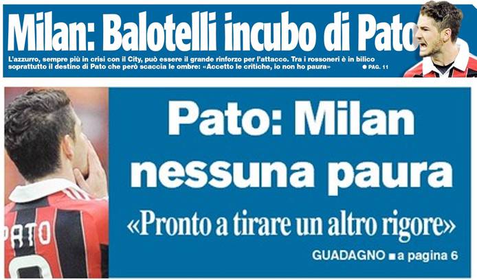 RASSEGNA STAMPA MILAN FOTO – Di seguito potete trovare i principali titoli dei tre quotidiani sportivi, La Gazzetta dello Sport, Corriere dello Sport e Tuttosport, riguardanti naturalmente il nostro Milan. In edicola solo CorSport e Tuttosport per via dello sciopero della Gazzetta. I due quotidiani sportivi parlano di Pato riprendendo le dichiarazioni dello stesso a Milan Channel di ieri, che ha smentito l’aggressione fuori San Siro. Si sottolinea inoltre l’interesse dei rossoneri per Balotelli, considerato il vero erede di Alexandre Pato per giugno o gennaio.