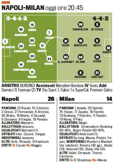 NAPOLI MILAN PROBABILI FORMAZIONI – Più in basso potrete gustarvi le probabili formazioni di Napoli-Milan, gara che si giocherà questa sera alle ore 20.45 per il posticipo del sabato della tredicesima giornata di Serie A. L’allenatore, Massimiliano Allegri, sembra intenzionato a tornare al 4-4-2 vista l’assenza di capitan Ambrosini per squalifica. Spazio quindi a De Jong in cabina di regia affiancato da Montolivo con Nocerino ed Emanuelson sulle due corsie. In attacco si vedrà dal primo minuto la coppia El Shaarawy-Bojan.