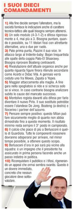 10 COMANDAMENTI DI BERLUSCONI – Con il ritorno in prima fila di Silvio Berlusconi in casa Milan è possibile stilare una lista dei 10 nuovi comandamenti del patron rossonero. Un elenco suddiviso in 10 punti che la squadra, la società e il tecnico, dovranno rispettare da qui fino alla fine della stagione per tornare grandi. Peccato però che già durante il match di Napoli, mister Allegri abbia “peccato” in diverse occasioni non rispettando gli ultimi diktat presidenziali. Il risultato di 2 a 2 ha però concesso delle attenuanti al tecnico livornese ma dal prossimo match bisognerà cercare di seguire le nuove indicazioni…