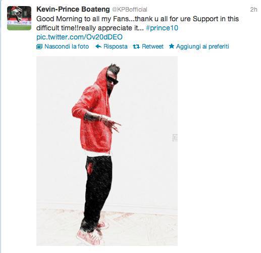 MILAN – Kevin Prince Boateng, centrocampista del Milan, ha voluto ringraziare i tifosi per la vicinanza nei suoi confronti nonostante il visibile momento difficoltà che lo stesso ghanese sta vivendo. Ecco di seguito lo “stamp” del suo Twitter. Per tutti coloro che non conoscessero l’inglese, Prince ha voluto ringraziare i tifosi del Milan per la vicinanza verso di lui nonostante le prestazioni non siano all’altezza delle attese.