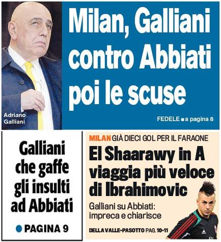 RASSEGNA STAMPA MILAN FOTO – Di seguito potete trovare i principali titoli dei tre quotidiani sportivi, La Gazzetta dello Sport, Corriere dello Sport e Tuttosport, riguardanti naturalmente il nostro Milan. Le tre prime pagine dei principali quotidiani sportivi si dedicano in particolare alla gaffe dell’ad Adriano Galliani nei confronti di Christian Abbiati. Il numero due rossonero è stato catturato mentre inveiva contro l’estremo difensore rossonero ma poi il caso è rientrato. La Gazza si sofferma anche su El Shaarawy paragonandolo a Ibrahimovic…