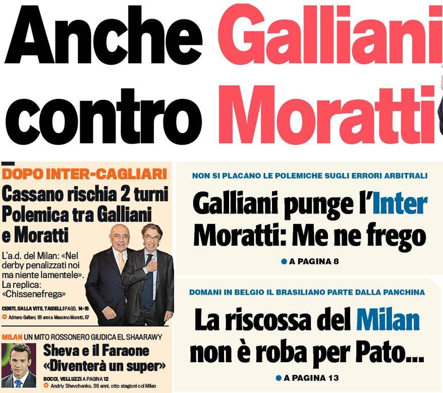 RASSEGNA STAMPA MILAN FOTO – Di seguito potete trovare i principali titoli dei tre quotidiani sportivi, La Gazzetta dello Sport, Corriere dello Sport e Tuttosport, riguardanti naturalmente il nostro Milan. Si parla di Anderlecht-Milan e dell’esclusione di Alexandre Pato, della diatriba fra l’ad Galliani e Moratti, nonchè di Shevchenko che ha incoronata El Shaarawy come proprio erede dopo la visita di ieri da Giannino, nel noto ristorante in centro Milano, ritrovo dei rossoneri.