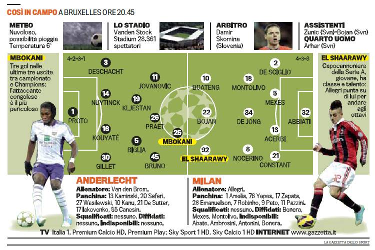 ANDERLECHT MILAN PROBABILI FORMAZIONI – Poco più in basso potrete visionare le probabili formazioni di Anderlecht-Milan, gara valevole per il quinto turno dei Gironi di Champions League, che si giocherà questa sera, alle ore 20.45, in quel di Bruxelles. Allegri dovrebbe rispolverare il 4-3-3 con Boateng, Bojan ed El Shaarawy in attacco anche se non è da escludere che disponga gli 11 in campo con un 4-2-3-1. Al di la dei dubbi offensivi il resto della formazione dovrebbe essere già scritto anche se c’è un possibile ballottaggio fra Yepes e Acerbi al centro difesa.