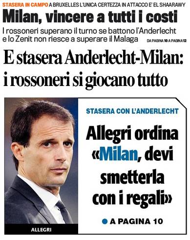 RASSEGNA STAMPA MILAN FOTO – Di seguito potete trovare i principali titoli dei tre quotidiani sportivi, La Gazzetta dello Sport, Corriere dello Sport e Tuttosport, riguardanti naturalmente il nostro Milan. I titoli sono naturalmente concentrati sulla sfida in programma questa sera fra l’Anderlecht e il Milan. “Milan vincere a tutti i costi”, è questo il titolo de La Gazzetta dello Sport. Poi troviamo un “Milan, smettila di fare regali”. E infine un “I rossoneri si giocano tutto”. Tutti titoli, come dicevamo, riguardanti il match di Champions.