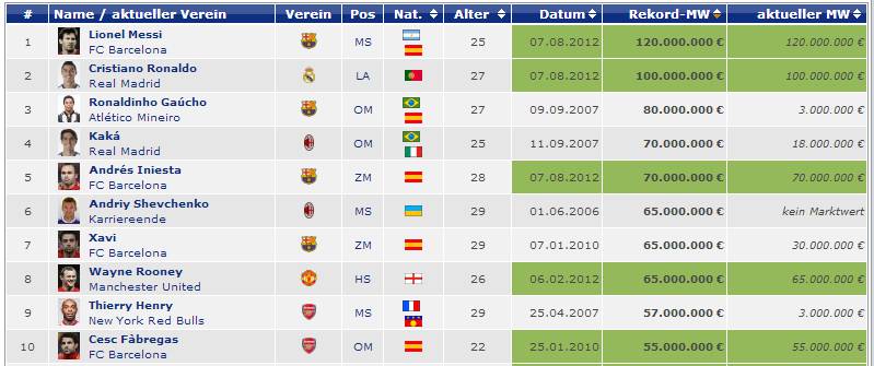 VALORE 10 GIOCATORI MODERNI – Il noto sito tedesco transfermarkt.de ha stilato la classifica dei 10 giocatori di maggiore valore dal 2004 ad oggi. Al primo posto, come non poteva essere altrimenti, troviamo Lionel Messi, seguito a ruota da Cristiano Ronaldo. Terzo posto per Ronaldinho che nel 2007, quand’era al Barcellona, ha toccato quota 80 milioni di euro mentre al quarto piazzamento troviamo Kakà (ai tempi del Milan 2007). Seguono Iniesta e un altro ex Milan come Shevchenko che nel 2006 toccò quota 65 milioni di euro, prima di iniziare la parabola discendente fra le fila del Chelsea. Chiudono la speciale classifica Rooney, Fabregas, Xavi e Henry.