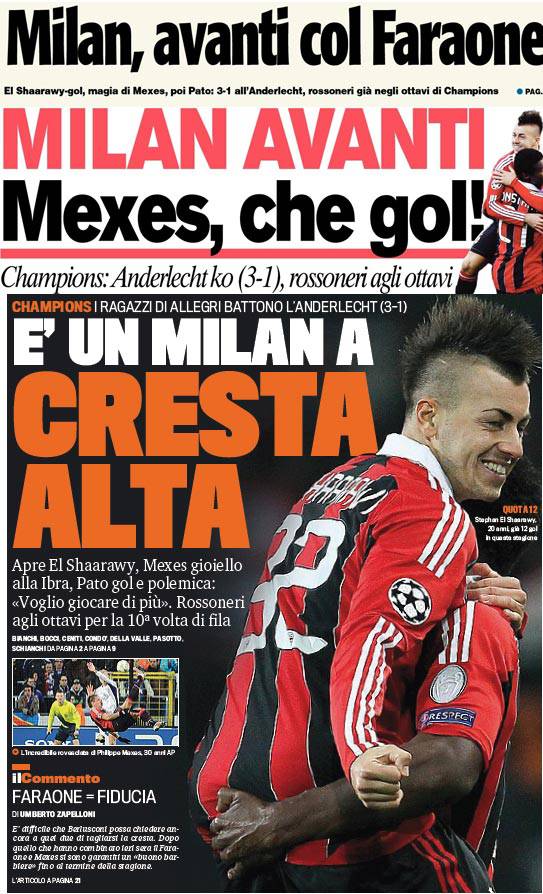 RASSEGNA STAMPA MILAN FOTO – Di seguito potete trovare i principali titoli dei tre quotidiani sportivi, La Gazzetta dello Sport, Corriere dello Sport e Tuttosport, riguardanti naturalmente il nostro Milan. Naturalmente i titoli dei tre quotidiani sono concentrati sulla sfida di ieri di Champions League fra il Milan e l’Anderlecht giocatasi a Bruxelles, valevole per il quinto turno dei Gironi di Champions e conclusasi con il risultato di 3 a 1 in favore dei nostri rossoneri, dopo ennesimo gol di El Shaarawy e una straordinaria magia di Philippe Mexes.