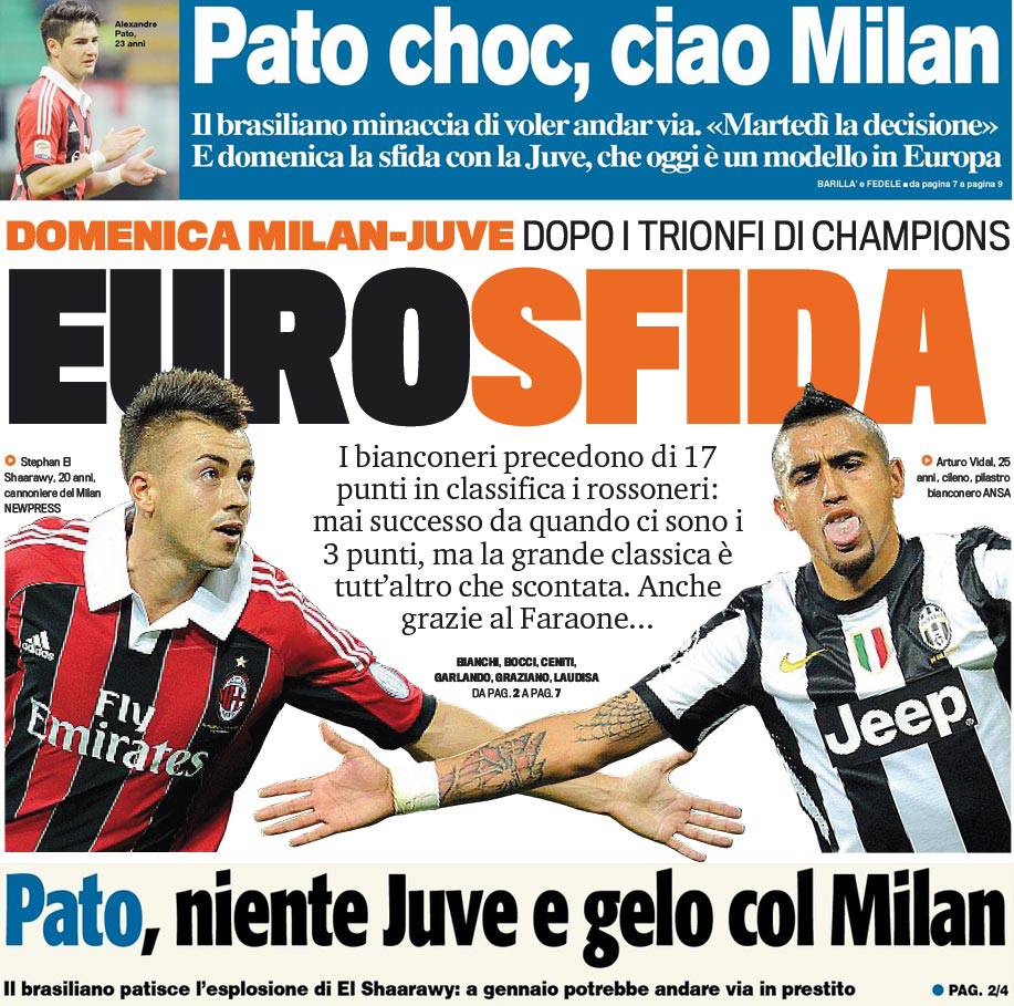 RASSEGNA STAMPA MILAN FOTO – Di seguito potete trovare i principali titoli dei tre quotidiani sportivi, La Gazzetta dello Sport, Corriere dello Sport e Tuttosport, riguardanti naturalmente il nostro Milan. I principali titoli sono dedicati alla vicenda Alexandre Pato che con grande probabilità lascerà il Milan dopo le recenti dichiarazioni post Anderlecht-Milan. Naturalmente, spazio anche al big match di domenica sera la gara ad alto tasso di spettacolo contro la Juventus, una vera euro sfida! Non ci resta che iniziare il conto alla rovescia…