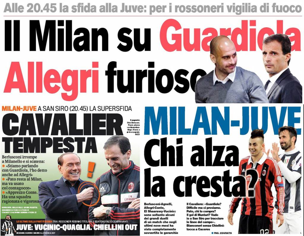 RASSEGNA STAMPA MILAN FOTO – Di seguito potete trovare i principali titoli dei tre quotidiani sportivi, La Gazzetta dello Sport, Corriere dello Sport e Tuttosport, riguardanti naturalmente il nostro Milan. Naturalmente i titoli principali riguardano la super sfida in programma questa sera fra il Milan e la Juventus in quel di San Siro. “Cavalier Tempesta” titola La Gazzetta dello Sport riferendosi alla visita del presidente Berlusconi di ieri a Milanello. Il Corsport invece, parla di “Guardiola al Milan, Allegri furioso”.