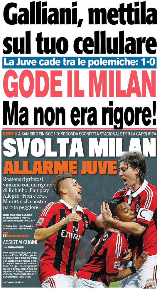 RASSEGNA STAMPA MILAN FOTO – Di seguito potete trovare i principali titoli dei tre quotidiani sportivi, La Gazzetta dello Sport, Corriere dello Sport e Tuttosport, riguardanti naturalmente il nostro Milan. Naturalmente i titoli dei tre quotidiani sportivi sono dedicati alla sfida di ieri sera fra la Juventus e il Milan, gara giocatasi allo stadio San Siro alle ore 20.45, valevole per il posticipo domenicale della quattordicesima giornata di Serie A. Rovente il titolo di Tuttosport che titola “Galliani mettila sul cellulare”. Mentre La Gazzetta scrive Svolta Milan, Allarme Juve.