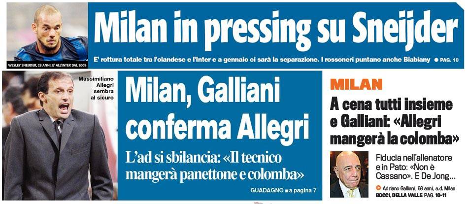 RASSEGNA STAMPA MILAN FOTO – Di seguito potete trovare i principali titoli dei tre quotidiani sportivi, La Gazzetta dello Sport, Corriere dello Sport e Tuttosport, riguardanti naturalmente il nostro Milan. Il quotidiano Tuttosport continua a parlare della possibilità che Sneijder, nerazzurro in partenza dall’Inter, possa a breve trasferirsi nel Milan, magari dietro uno scambio. Gazzetta e CorSport, invece, sottolineano le parole dell’ad rossonero Adriano Galliani sul futuro di Allegri, confermato non soltanto fino a Natale ma anche a carnevale e Pasqua…