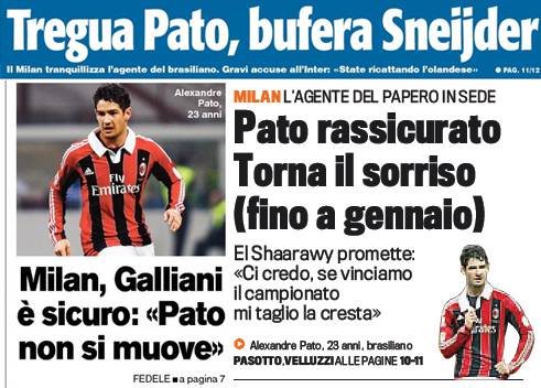 RASSEGNA STAMPA MILAN FOTO – Di seguito potete trovare i principali titoli dei tre quotidiani sportivi, La Gazzetta dello Sport, Corriere dello Sport e Tuttosport, riguardanti naturalmente il nostro Milan. Sui principali quotidiani sportivi si parla in particolare della permanenza di Alexandre Pato al Milan dopo l’incontro tenutosi ieri pomeriggio fra l’agente dello stesso Papero, Gilmar Veloz, e l’amministratore delegato rossonero Adriano Galliani. Il giocatore dovrebbe rimanere a meno di colpi di scena.