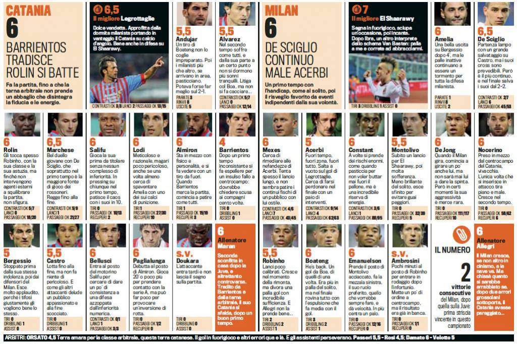 CATANIA MILAN VOTI PAGELLE GAZZETTA SPORT – Poco più in basso potrete visionare i voti e le pagelle Gazzetta dello Sport di Catania-Milan, sfida giocatasi ieri sera allo stadio Massimino, gara valevole per l’anticipo del venerdì del quindicesimo turno di Serie A e conclusasi con il risultato di 1 a 3 in favore dei rossoneri, non senza polemiche per via di alcune sviste arbitrali da ambo le parti. Il migliore dell’incontro in assoluto è risultato essere il solito El Shaarawy, che come sottolinea la Rosea, sembra Van Basten. Malissimo il fischietto di gara, Orsato, bocciato con un eloquente 4,5.