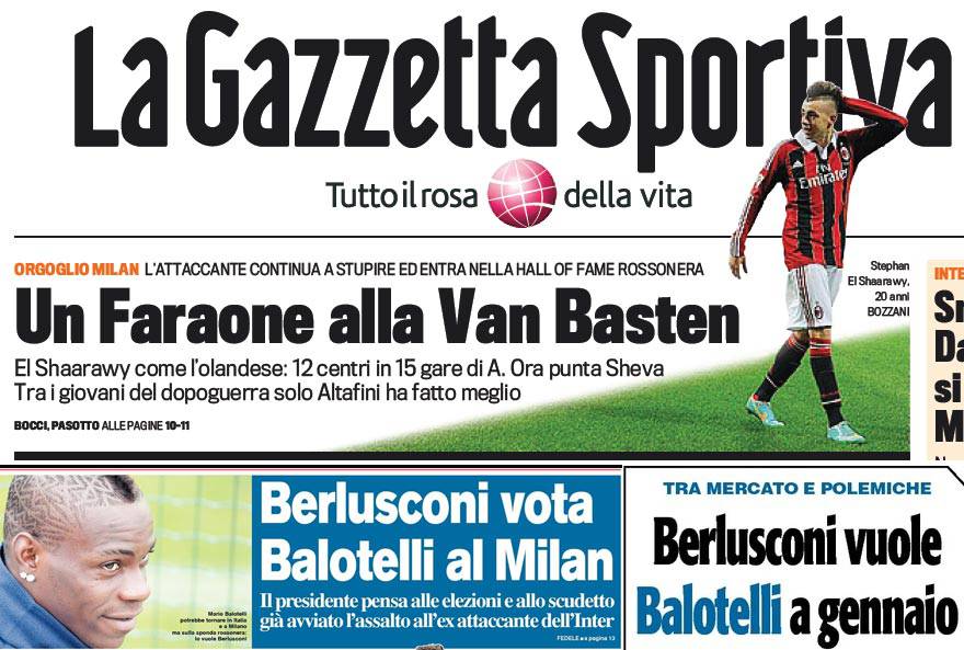 RASSEGNA STAMPA MILAN FOTO – Di seguito potete trovare i principali titoli dei tre quotidiani sportivi, La Gazzetta dello Sport, Corriere dello Sport e Tuttosport, riguardanti naturalmente il nostro Milan. Si parla molto di mercato stamane in particolare sul Corriere dello Sport e su Tuttosport, dove si sottolinea l’interesse di Silvio Berlusconi per Super Mario Balotelli, possibile già durante il mercato di riparazione del prossimo mese di gennaio. La Gazzetta, invece, si sofferma sull’inizio di stagione straordinario di El Shaarawy, che sembra Van Basten