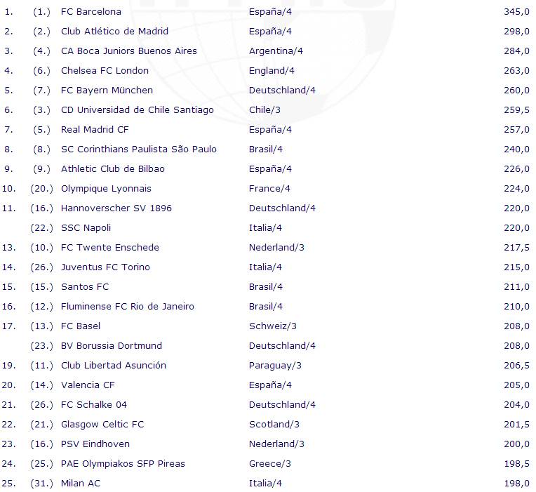 CLASSIFICA IFFHS – La nota Iffhs, l’istituto di statistiche del calcio mondiale, ha aggiornato la classifica relativi alle squadre di club più forte al mondo. In testa continua ad esservi, in posizione salda, il Barcellona, seguita dall’Atletico Madrid e dal Boca. La prima italiana è invece il Napoli, undicesima, mentre il Milan è al 25esimo posto, frutto anche di un inizio di stagione sicuramente non positivo. Nelle prime 25 presente anche la Juventus al quattordicesimo piazzamento. Di seguito la classifica completa, buona lettura.