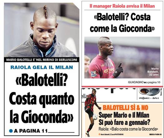 RASSEGNA STAMPA MILAN FOTO – Di seguito potete trovare i principali titoli dei tre quotidiani sportivi, La Gazzetta dello Sport, Corriere dello Sport e Tuttosport, riguardanti naturalmente il nostro Milan. I tre quotidiani sportivi si dedicano in particolare alle dichiarazioni rilasciate ieri dall’agente di Mario Balotelli, Mino Raiola, ai microfoni di Sky Sport 24 sul fatto che il suo assistito costi come la Gioconda e che il Milan non se lo possa permettere. Vedremo come finirà questa vicenda…