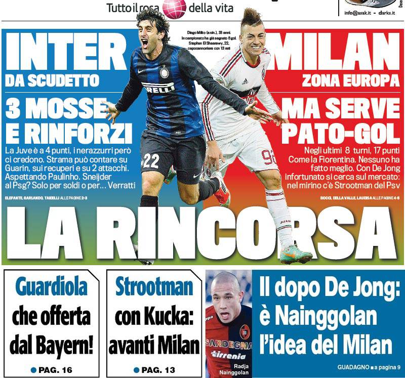 RASSEGNA STAMPA MILAN FOTO – Di seguito potete trovare i principali titoli dei tre quotidiani sportivi, La Gazzetta dello Sport, Corriere dello Sport e Tuttosport, riguardanti naturalmente il nostro Milan. Si parla molto di mercato ed in particolare del possibile sostituto di Nigel De Jong, che ricordiamo, si è infortunato e sarà out per tutta la stagione. Al suo posto potrebbe arrivare uno fra Strootma, Kucka o Nainggolan. Intanto la Gazza stila la strategia per arrivare in Europa: servono assolutamente i gol di Alexandre Pato.