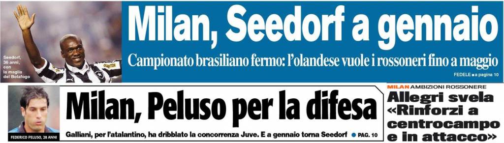 Rassegna stampa Milan: torna Seedorf! Peluso per la difesa e Allegri svela gli obiettivi per il mercato – Foto 16/12/2012 - 13:3716/12/2012 - 07:07 di Redazione2 RASSEGNA STAMPA MILAN FOTO – Di seguito potete trovare i principali titoli dei tre quotidiani sportivi, La Gazzetta dello Sport, Corriere dello Sport e Tuttosport, riguardanti naturalmente il nostro Milan. La redazione di Milanlive.it