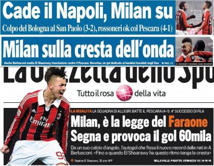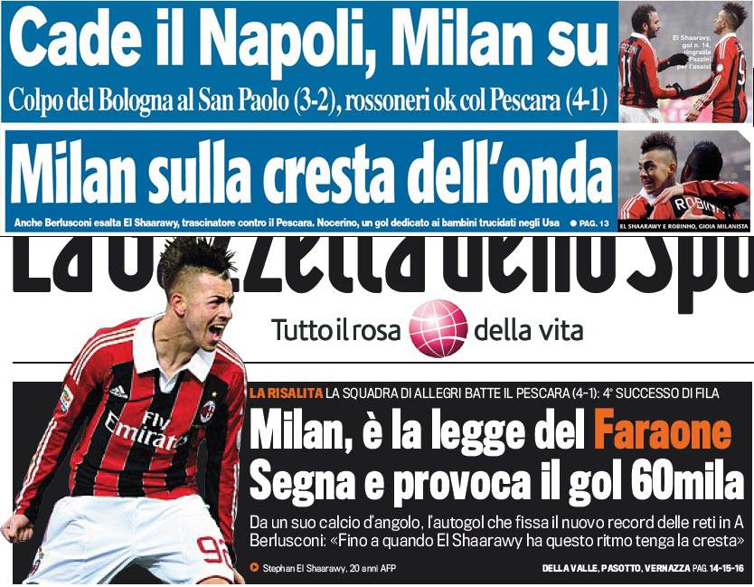 Rassegna stampa Milan: Sulla cresta dell’onda, Berlusconi non taglia la cresta al Faraone… – Foto 17/12/2012 - 15:2117/12/2012 - 07:09 di Redazione2 RASSEGNA STAMPA MILAN FOTO – Di seguito potete trovare i principali titoli dei tre quotidiani sportivi, La Gazzetta dello Sport, Corriere dello Sport e Tuttosport, riguardanti naturalmente il nostro Milan. La redazione di Milanlive.it