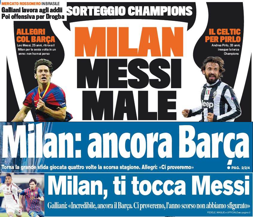 Rassegna stampa Milan: Messi male, Galliani cede e poi prepara l’offensiva per Drogba- Foto 23/12/2012 - 17:3721/12/2012 - 07:26 di Redazione2 RASSEGNA STAMPA MILAN FOTO – Di seguito potete trovare i principali titoli dei tre quotidiani sportivi, La Gazzetta dello Sport, Corriere dello Sport e Tuttosport, riguardanti naturalmente il nostro Milan. La redazione di Milanlive.it