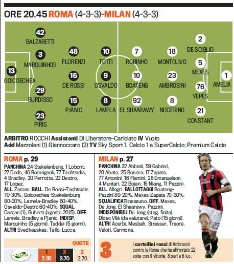 ROMA MILAN PROBABILI FORMAZIONI – Poco più in basso potete visionare le probabili formazioni di Roma-Milan, firmate Gazzetta dello Sport, gara che si giocherà questa sera alle ore 20.45, allo stadio Olimpico di Roma, match valevole per il diciottesimo turno di Serie A, l’ultimo del 2012. Allegri sembra deciso a puntare su uno schema senza una vera prima punta, il classico falso nueve, con Boateng in mezzo all’attacco, spalleggiato da El Shaarawy e Robinho. In difesa torna Mexes dal primo minuto al fianco di Yepes.
