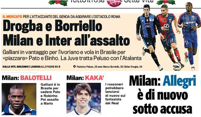 Rassegna stampa Milan: Drogba, Balotelli e Kakà, Milan in missione – Foto 27/12/2012 - 17:2324/12/2012 - 07:08 di Redazione2 RASSEGNA STAMPA MILAN FOTO – Di seguito potete trovare i principali titoli dei tre quotidiani sportivi, La Gazzetta dello Sport, Corriere dello Sport e Tuttosport, riguardanti naturalmente il nostro Milan. La redazione di Milanlive.it