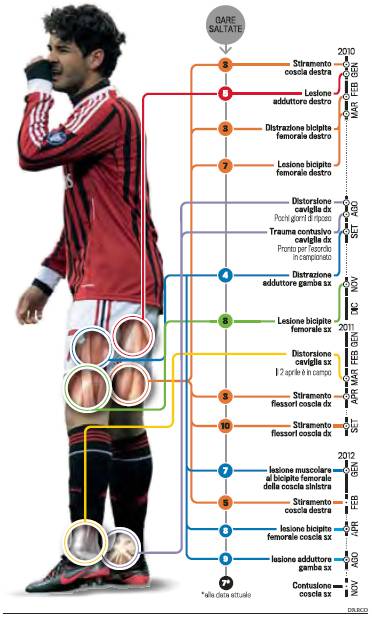 CALCIOMERCATO MILAN – Sono ben 16 gli infortuni di Alexandre Pato dal gennaio del 2010 al novembre del 2012. Sedici stop di natura muscolare, spesso incompresi/incomprensibili, a cui anche i medici del Milan, noti per la loro professionalità, non sono riusciti a trovare una soluzione. Continui stop, soprattutto negli ultimi due anni, che hanno indotto la dirigenza rossonera a cedere il giocatore al miglior offerente, leggasi il Corinthians. La Gazzetta dello Sport ha realizzato una fotografia per indicare in maniera sintetica ogni infortunio del Pato con le relative date e partite giocate: eccola di seguito.