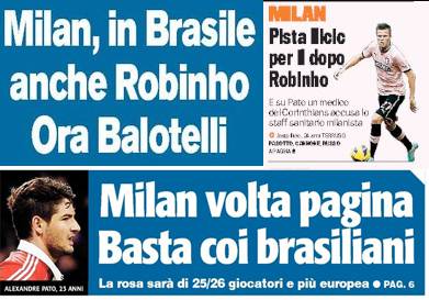 Rassegna stampa Milan: anche Robinho in Brasile, ora Balotelli! Idea Ilicic… – Foto 30/12/2012 - 18:5228/12/2012 - 07:06 di Redazione2 RASSEGNA STAMPA MILAN FOTO – Di seguito potete trovare i principali titoli dei tre quotidiani sportivi, La Gazzetta dello Sport, Corriere dello Sport e Tuttosport, riguardanti naturalmente il nostro Milan. La redazione di Milanlive.it