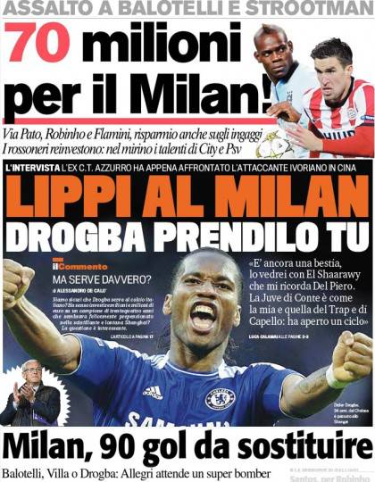 Rassegna stampa Milan: 70 milioni di tesoretto, 90 gol da sostituire, Lippi consiglia Drogba – Foto 30/12/2012 - 18:5129/12/2012 - 07:54 di Redazione2 RASSEGNA STAMPA MILAN FOTO – Di seguito potete trovare i principali titoli dei tre quotidiani sportivi, La Gazzetta dello Sport, Corriere dello Sport e Tuttosport, riguardanti naturalmente il nostro Milan. La redazione di Milanlive.it