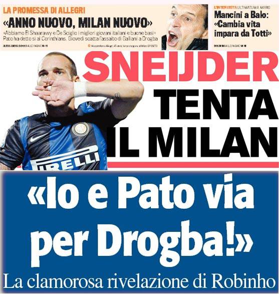 Rassegna stampa Milan: Sneijder tenta il Milan, giovedì Drogba,Pato è del Corinthians – Foto 04/01/2013 - 13:4331/12/2012 - 07:09 di Redazione2 RASSEGNA STAMPA MILAN FOTO – Di seguito potete trovare i principali titoli dei tre quotidiani sportivi, La Gazzetta dello Sport, Corriere dello Sport e Tuttosport, riguardanti naturalmente il nostro Milan. La redazione di Milanlive.it