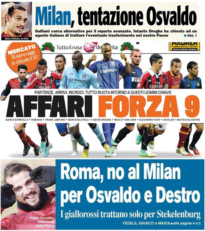 Rassegna stampa Milan: cedere subito per la tentazione Osvaldo o per Drogba – Foto 04/01/2013 - 13:4103/01/2013 - 07:09 di Redazione2 RASSEGNA STAMPA MILAN FOTO – Di seguito potete trovare i principali titoli dei tre quotidiani sportivi, La Gazzetta dello Sport, Corriere dello Sport e Tuttosport, riguardanti naturalmente il nostro Milan. La redazione di Milanlive.it