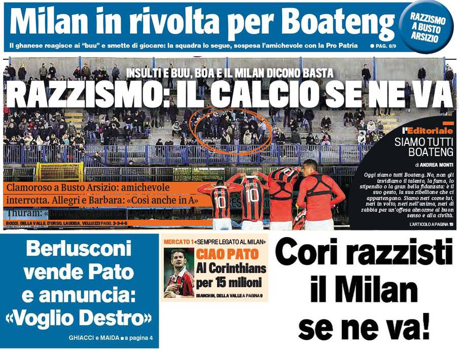 Rassegna stampa Milan: siamo tutti Boateng! Berlusconi vende Pato e vuole Destro – Foto 04/01/2013 - 13:3904/01/2013 - 07:11 di Redazione2 RASSEGNA STAMPA MILAN FOTO – Di seguito potete trovare i principali titoli dei tre quotidiani sportivi, La Gazzetta dello Sport, Corriere dello Sport e Tuttosport, riguardanti naturalmente il nostro Milan. La redazione di Milanlive.it