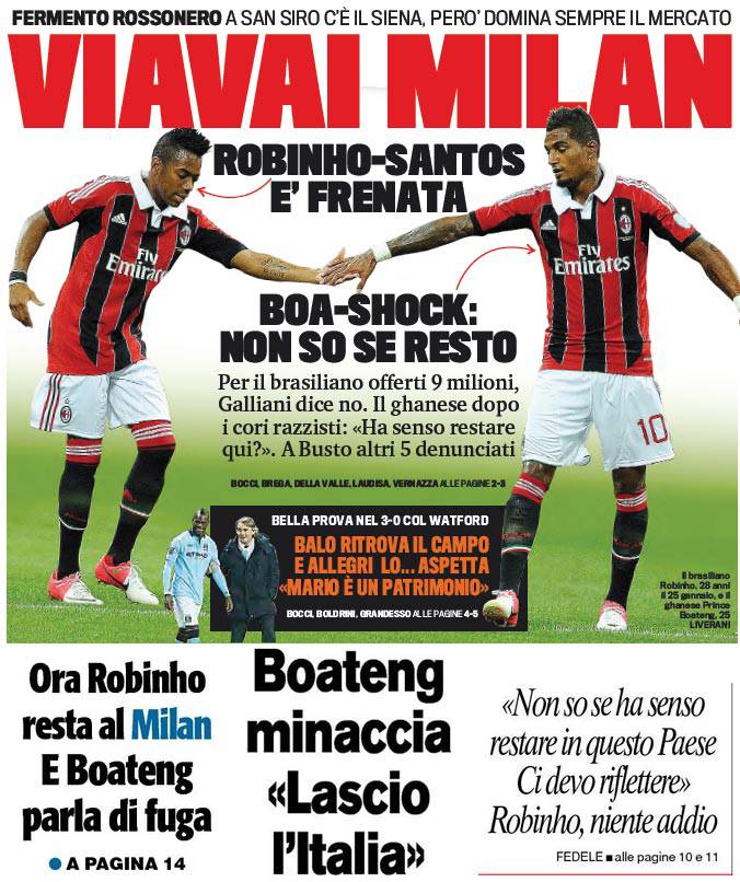 Rassegna stampa Milan: via vai Milan, Boa shock “Non so se resto”, Binho rimane – Foto 09/01/2013 - 17:1606/01/2013 - 08:01 di Redazione2 RASSEGNA STAMPA MILAN FOTO – Di seguito potete trovare i principali titoli dei tre quotidiani sportivi, La Gazzetta dello Sport, Corriere dello Sport e Tuttosport, riguardanti naturalmente il nostro Milan. La redazione di Milanlive.it