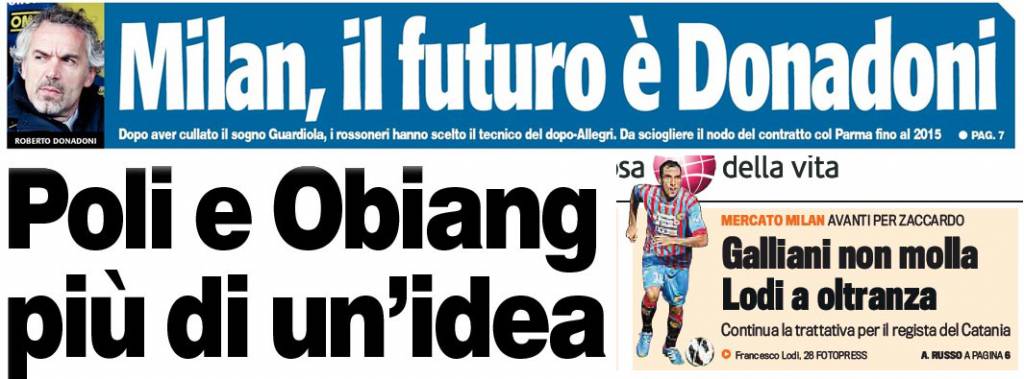 Rassegna stampa Milan: Poli e Obiang più che idee, Donadoni il futuro, Lodi ad oltranza – Foto 13/01/2013 - 16:2312/01/2013 - 07:09 di Redazione2 RASSEGNA STAMPA MILAN FOTO – Di seguito potete trovare i principali titoli dei tre quotidiani sportivi, La Gazzetta dello Sport, Corriere dello Sport e Tuttosport, riguardanti naturalmente il nostro Milan. La redazione di Milanlive.it