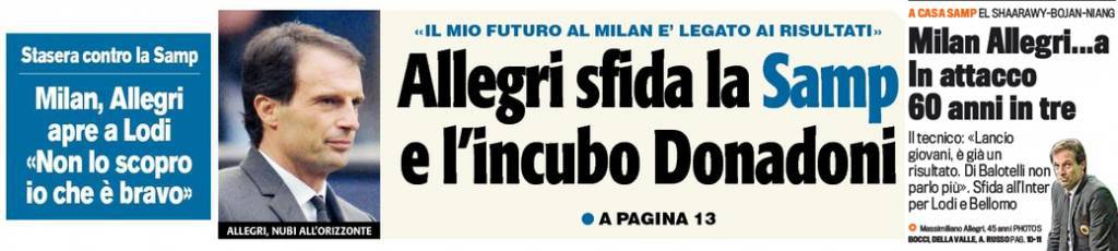 Rassegna stampa Milan: Allegri chiama Lodi e sfida Donadoni, 60 anni in 3 in attacco… – Foto 13/01/2013 - 16:2213/01/2013 - 08:01 di Redazione2 RASSEGNA STAMPA MILAN FOTO – Di seguito potete trovare i principali titoli dei tre quotidiani sportivi, La Gazzetta dello Sport, Corriere dello Sport e Tuttosport, riguardanti naturalmente il nostro Milan. La redazione di Milanlive.it
