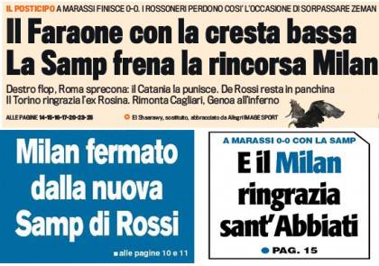 Rassegna stampa Milan: il Faraone con la cresta bassa, Milan fermato dalla Samp ringrazia Sant’Abbiati, – Foto 15/01/2013 - 18:1114/01/2013 - 07:22 di Redazione2 RASSEGNA STAMPA MILAN FOTO – Di seguito potete trovare i principali titoli dei tre quotidiani sportivi, La Gazzetta dello Sport, Corriere dello Sport e Tuttosport, riguardanti naturalmente il nostro Milan. La redazione di Milanlive.it