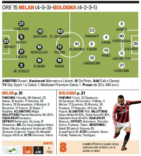 MILAN BOLOGNA PROBABILI FORMAZIONI – Poco più in basso potrete vedere le probabili formazioni firmate Gazzetta dello Sport di Milan-Bologna, gara che si giocherà questo pomeriggio alle ore 15.00 in quel dello stadio San Siro in Milano. Allegri sembra intenzionato a schierare ancora da titolare Niang al fianco di Pazzini ed El Shaarawy. Novità a centrocampo dove Montolivo andrà in regia, spalleggiato da Boateng nel ruolo di interno sinistro e da Flamini sulla destra. Infine la difesa con la coppia Zapata-Mexes in mezzo.